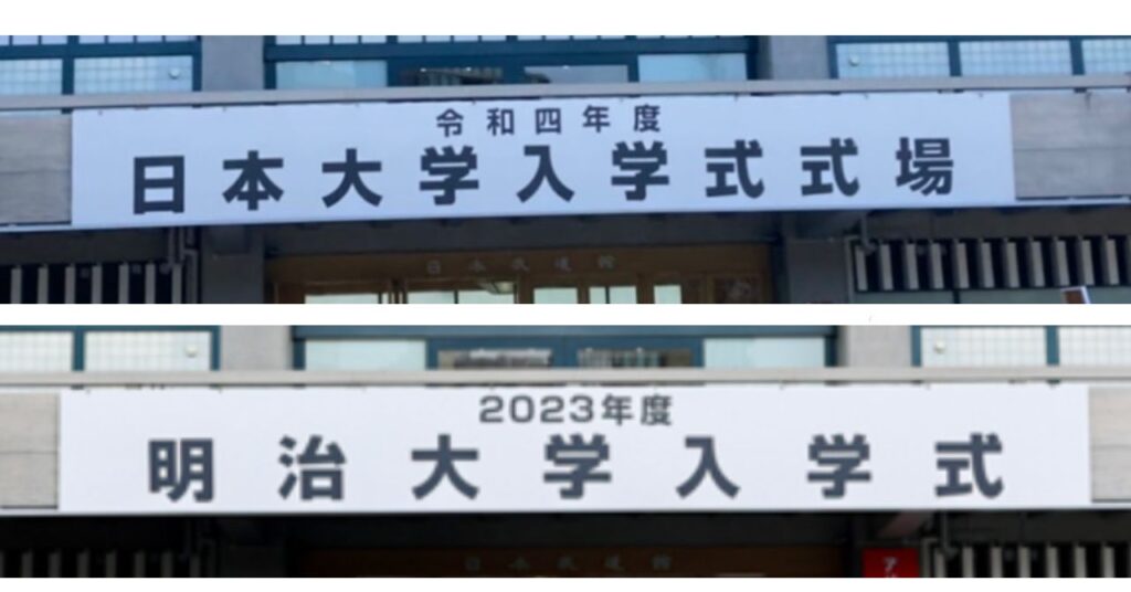 日野さんが入学した2023年の明治大学と日本大学の入学式を見ると、入学式の看板に違いがあるのがわかります。